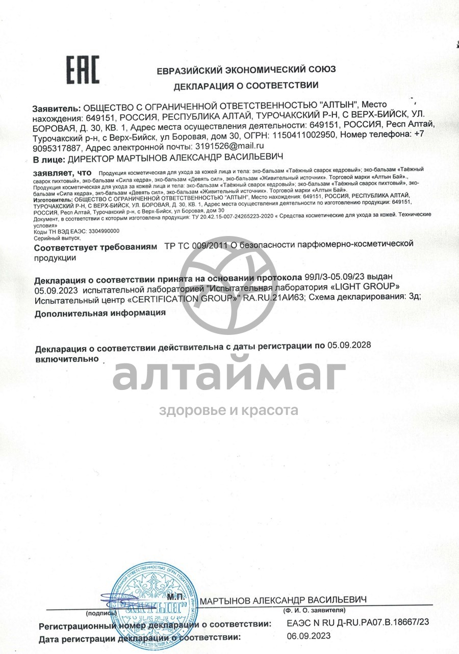 Масло кедрового ореха, пчелиный воск, экстракт сабельника, экстракт омика, экстракт корня репейника, мумиё алтайское, масло эфирное пихтовое, масло эфирное кедровое, масло эфирное сосновое.Способ применения
