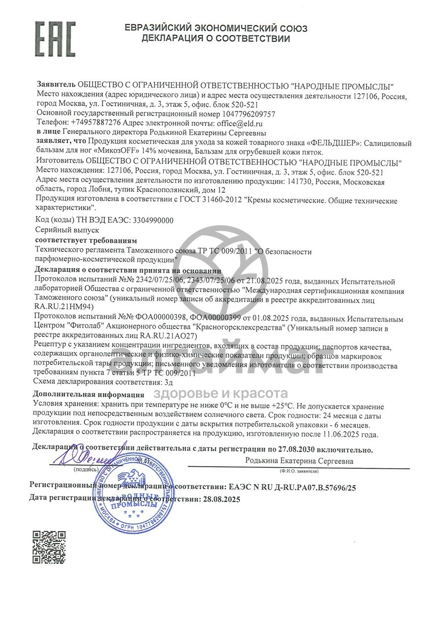 Способ применения: Нанесите бальзам на предварительно очищенную кожу стоп, равномерно распределяя и слегка массируя до полного впитывания. Применяйте ежедневно утром и вечером. Для достижения максимального смягчения обильно нанесите бальзам, оберните стопы пленкой, наденьте носки, через 1-1,5 часа снимите пленку. Остатки бальзама можно втереть или снять сухой салфеткой.