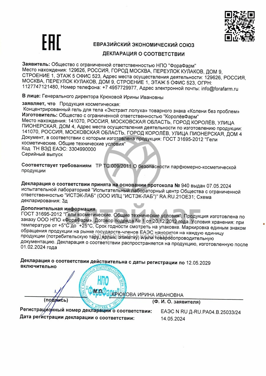Гель для тела Колени без проблем Экстракт лопуха 125мл оптом