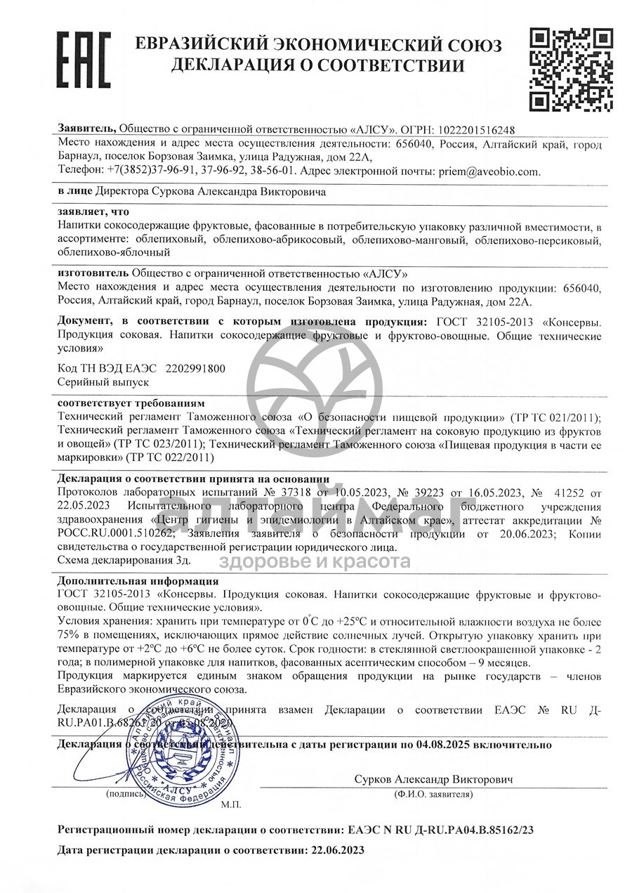 Изготовлен из натурального сока Алтайской облепихи и мангового пюре.