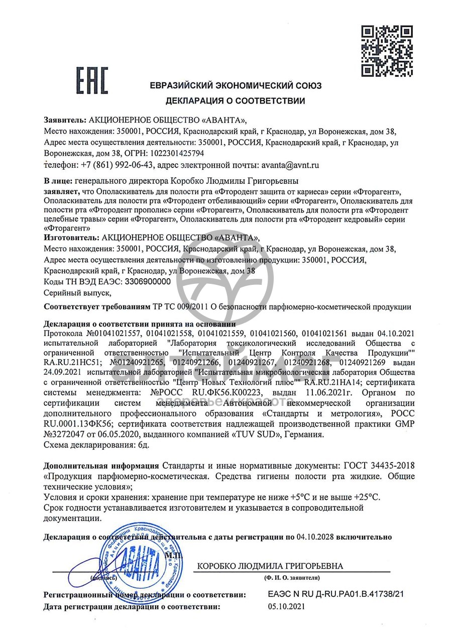Состав: вода, пропиленгликоль, сорбитол, ПЭГ-40 гидрогенизированное касторовое масло, экстракт лаванды, масло эфирное мятное, масло кедрового ореха, фтористый натрий, лаурилсульфат натрия, динатрий ЭДТА, триклозан, натрий метилпарабен, ДМДМ гидантоин, сахарин натрия, ванилин, CI 42090, CI 19140, СI 16255. Ingredients: Aqua, Propylene Glycol, Sorbitol, PEG-40 Hydrogenated Castor Oil, Lavandula Angustifolia Extrасt, Mentha Piperita Oil, Сedrus Sibirica Seed Oil, Sodium Fluoride, Sodium Lauryl Sulfate, Disodium EDTA, Triclosan, Sodium Methylparaben, DMDM Hydantoin, Sodium Saccharin, Vanillin, СI 42090, CI 19140, СI 16255. |
