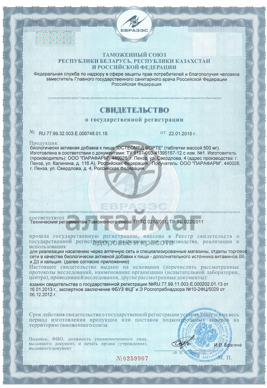 Купите Остеомед Форте таблетки 60 шт массой 500мг Парафарм по оптовой цене с доставкой до вашего склада или заберите заказ из ближайшего пункта выдачи транспортной компании, сделав заказ на opt.altaimag.ru. Цена оптом на Остеомед Форте таблетки 60 шт массой 500мг Парафарм — 620.71 ₽. Инструкцию по применению, описание и сертификаты вы можете посмотреть в карточке товара. Чтобы купить Остеомед Форте таблетки 60 шт массой 500мг Парафарм совершите всего несколько шагов: укажите количество продукта и нажмите на кнопку «Добавить в корзину» или позвоните по телефону по номеру +7 (499) 348 1482 в Москве или 8 (800) 500-45-25 (звонок по РФ бесплатный).