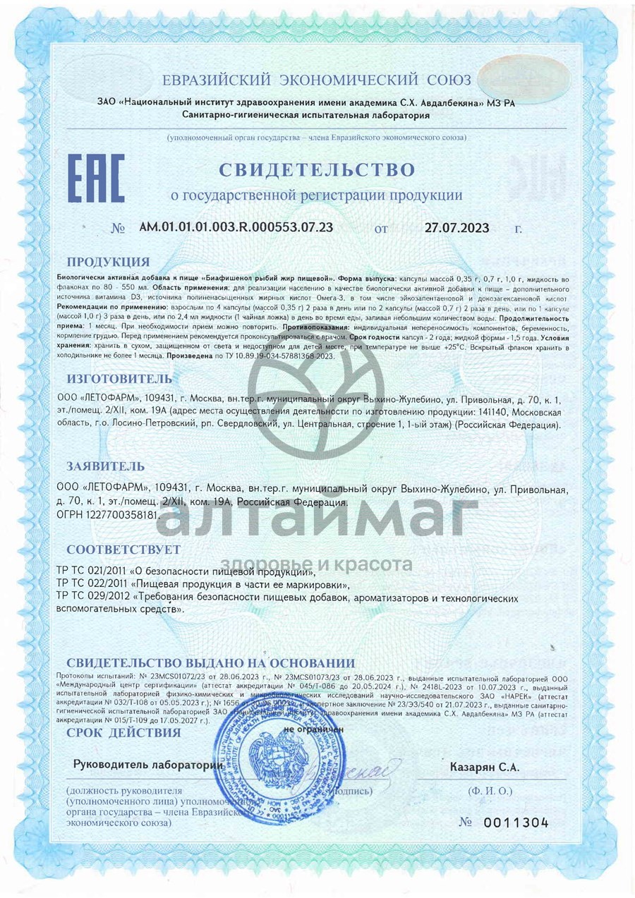 Рыбий жир пищевой Биафишенол Летофарм БАД 240 капсул оптом