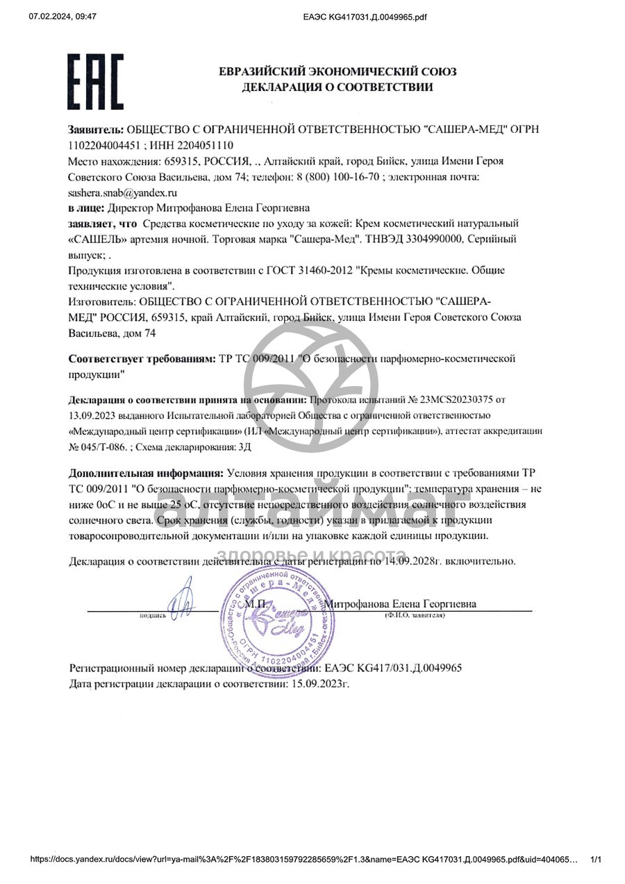 Состав Сашель Артемия Крем натуральный ночной:
