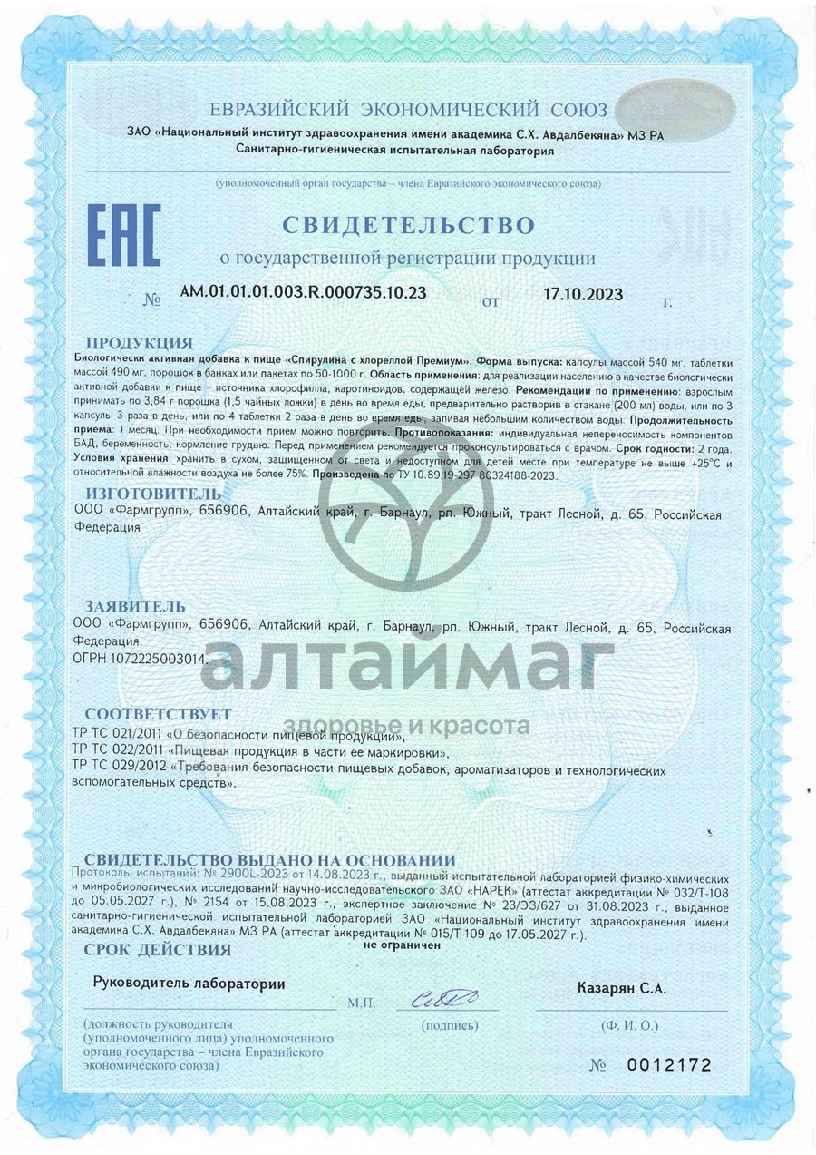 Купите Спирулина с хлореллой премиум Фармгрупп 240 таблеток по оптовой цене с доставкой до вашего склада или заберите заказ из ближайшего пункта выдачи транспортной компании, сделав заказ на opt.altaimag.ru. Цена оптом на Спирулина с хлореллой премиум Фармгрупп 240 таблеток — 728.81 ₽. Инструкцию по применению, описание и сертификаты вы можете посмотреть в карточке товара. Чтобы купить Спирулина с хлореллой премиум Фармгрупп 240 таблеток совершите всего несколько шагов: укажите количество продукта и нажмите на кнопку «Добавить в корзину» или позвоните по телефону по номеру +7 (499) 348 1482 в Москве или 8 (800) 500-45-25 (звонок по РФ бесплатный).