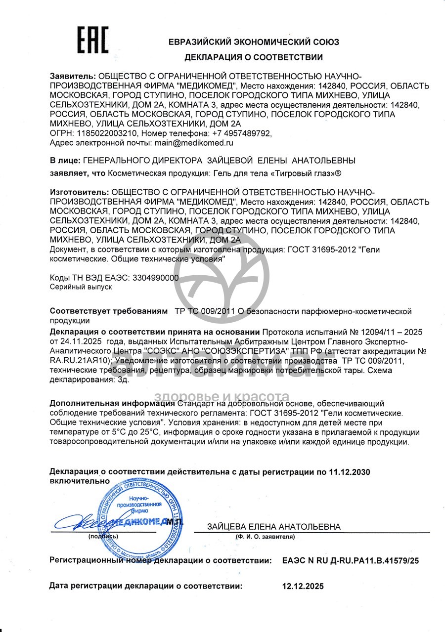Тигровый глаз с Бишофитом оказывает противовоспалительное, противоотечное и косметическое действие.